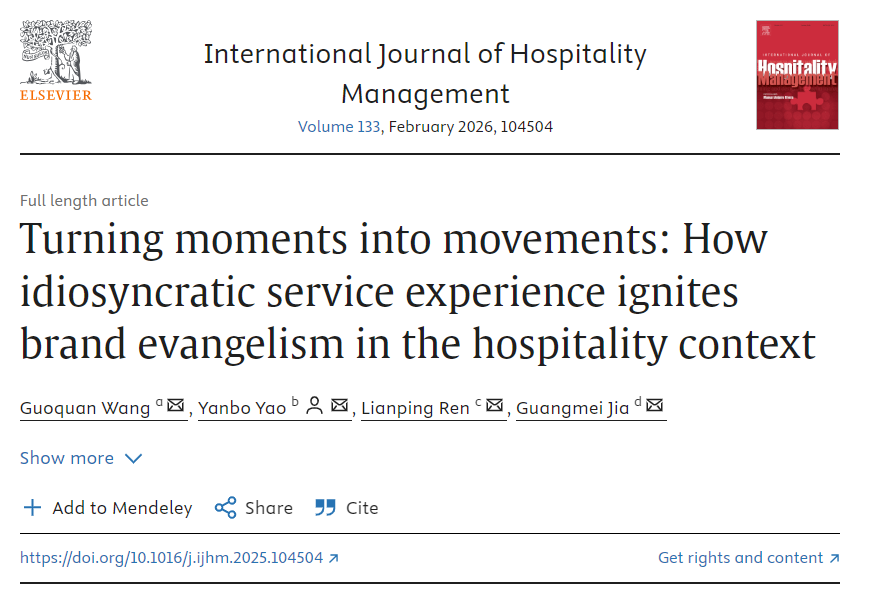 查看详情(通讯员 王国权)近日,我院姚延波教授团队完成的研究成果《Turning moments into movements: How idiosyncratic service experience ignites brand evangelism in the hospitality context》在国际高水平期刊《International Journal of Hospitality Management》上发表。在竞争日益激烈的酒店及餐饮业中,员工仅提供标准化服务已难以形成持久的竞争优势。近年来,一些接待业品牌开始注重在服务提供的过程中注入一些个性化的...