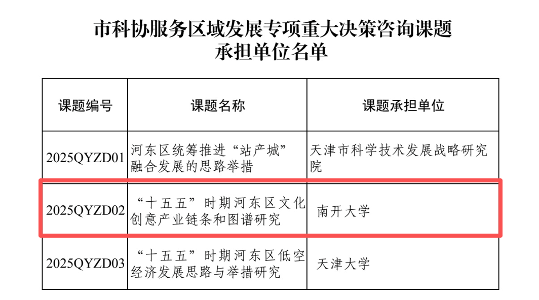 查看详情(通讯员 刘清雨)近日,天津市科学技术协会服务区域发展专项重大决策咨询课题启动,我院于海波副教授牵头申报的课题《“十五五”时期河东区文化创意产业链条和图谱研究》成功获批立项。该课题立足“十五五”时期加快河东区文化创意产业高质量发展的背景,聚焦河东区文化资源禀赋优势,围绕文化创意产业链条和图谱展开研究。研究预期融合政策分析法、实地调研法、案例对比法等经典研究方法,应用 AI 可视化分析工具,立足河东区...