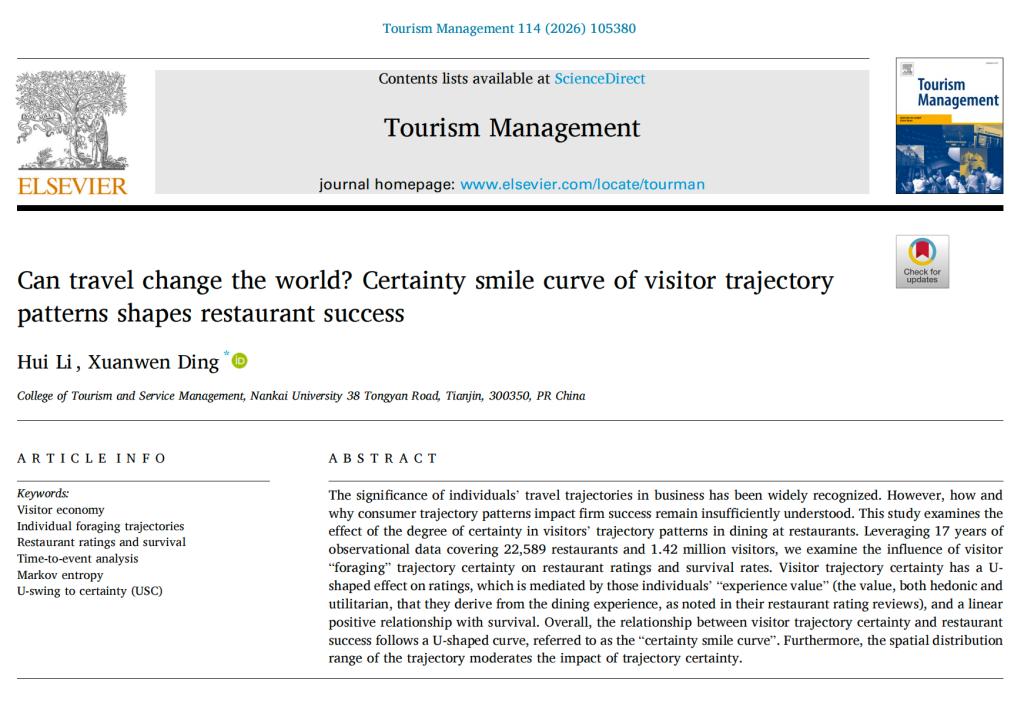 (通讯员 丁宣文)为通过中国学者理论创新构建旅游学科自主知识体系来落实人类命运共同体发展国家重大战略;我院李辉教授与博士生丁宣文合作完成的研究成果《Can travel change the world? Certainty smile curve of visitor trajectory patterns shapes restaurant success》被旅游管理学科国际三大顶尖期刊之一的Tourism Management接受并发表。现有研究已证实了消费者移动轨迹模式对企业战略管理的重要作用,但消费者移动轨...