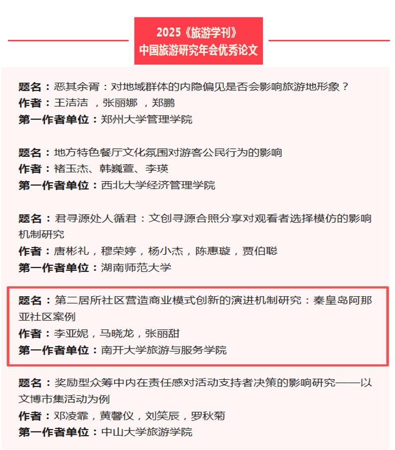 年会闭幕式上,同步开展《旅游学刊》2024 年度优秀论文与 2025 年会优秀会议论文表彰。其中,马晓龙老师合作完成的论文《第二居所社区营造商业模式创新的演进机制研究:秦皇岛阿那亚社区案例》,经编委会严格匿名评选与合议,成功入选 “2025《旅游学刊》中国旅游研究年会优秀会议论文”。我院师生李晓义、许威、李春晓合作发表于《旅游学刊》2024 年第 2 期的论文《非惯常理论新构:基于具身认知与双系统视角》,荣获“《旅游学刊》2024 年度优秀论文奖”。最后,《旅游学刊》副主编、海南大学国际旅游与公共管理学院的谢彦君教授作为颁奖嘉宾宣读颁奖词,李晓义副教授参加颁奖典礼并发表了获奖感言,表达了对《旅游学刊》及评审专家的感谢,表示将持续深耕相关领域,产出更多高质量研究成果。