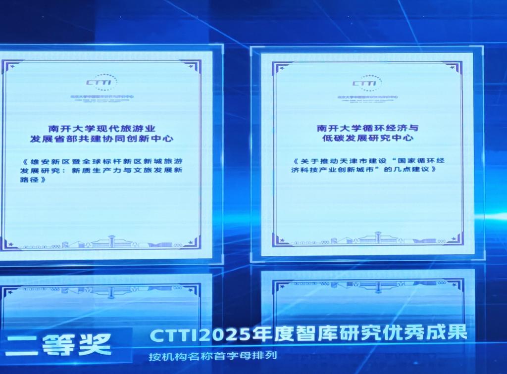 本次论坛发布了中国智库索引(CTTI)2025年度智库建设最佳案例和智库研究优秀成果,南开大学现代旅游业发展省部共建协同创新中心智库建设案例《扎根典型省持续跟踪服务,重大战略、人才培养与科研教学一体推进的高校智库地方服务模式》入选最佳案例(示范案例),这是中心自2022年以来连续第四次入选最佳案例,也是继2024年以后第二次获评示范案例。中心主任石培华教授的两个智库研究成果《贵州文化和旅游深度融合与高质量发展研究建议》和《雄安新区暨全球标杆新区新城旅游发展研究:新质生产力与文旅发展新路径》分别获中国智库索引(CTTI)2025年度智库建设优秀成果一等奖和二等奖,这也是中心参评成果连续第四年获得一等奖。