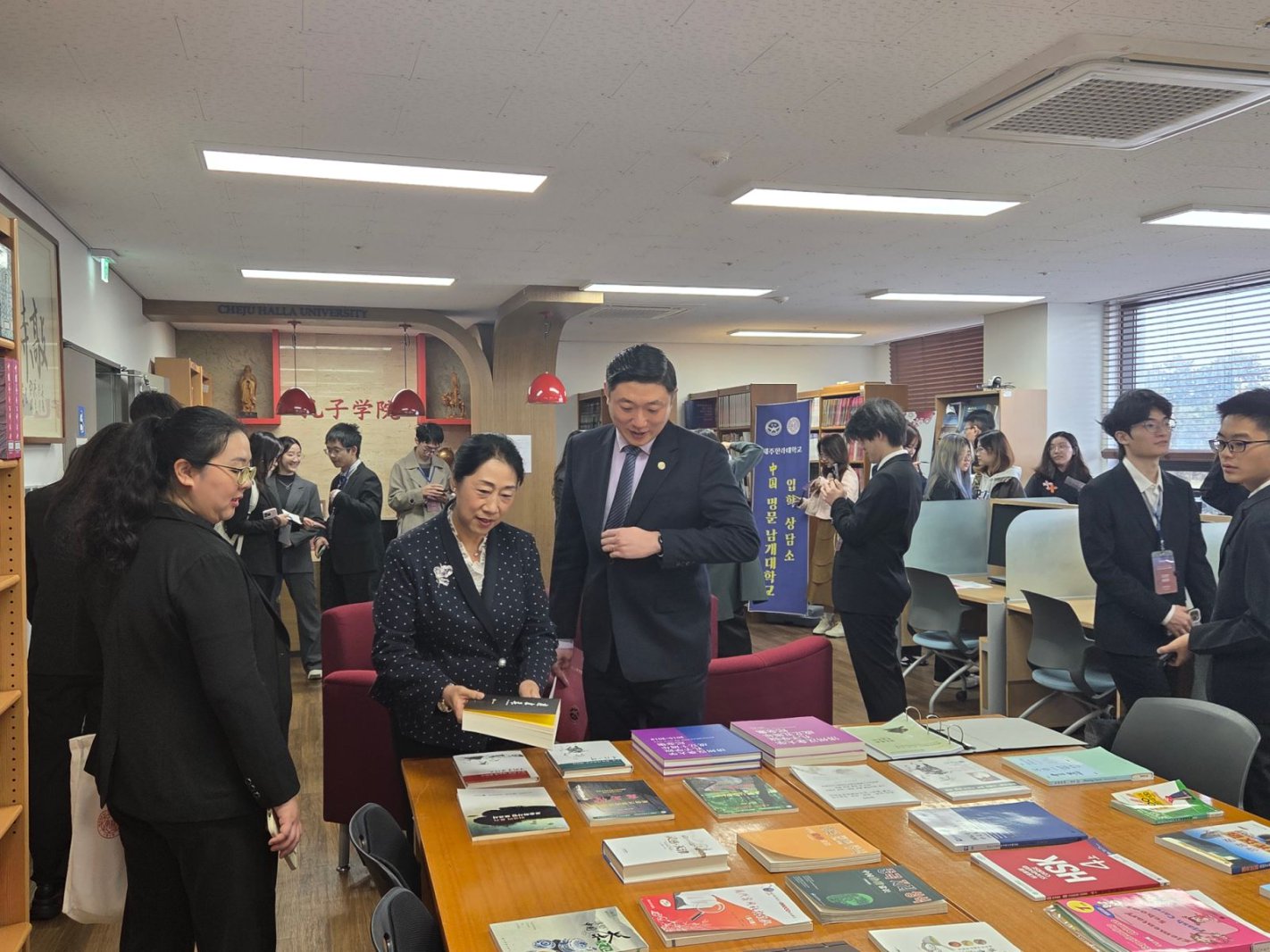 在济州汉拿大学访学期间,师生深入调研了该校旅游与酒店管理专业建设,参观了其酒店餐饮、马事、水上运动项目等特色专业实验室及由专业师生主导设计的数字艺术博物馆项目。济州汉拿大学国际交流副处长、旅游管理系主任、济州国际自由城市中心副主任李補连为访学师生详细介绍了学校发展概况,旅游学科教育理念、学生培养方式和就业情况等。在济州汉拿孔子学院院长王杉的陪同下,师生参观了孔子学院文化展厅和图书馆。王杉向师生们介绍了孔子学院举办的历次中国优秀文化展,展示了各类经典的国际中文教学教材,并与师生就中华优秀传统文化在韩国的传播和中文教学情况进行交流。