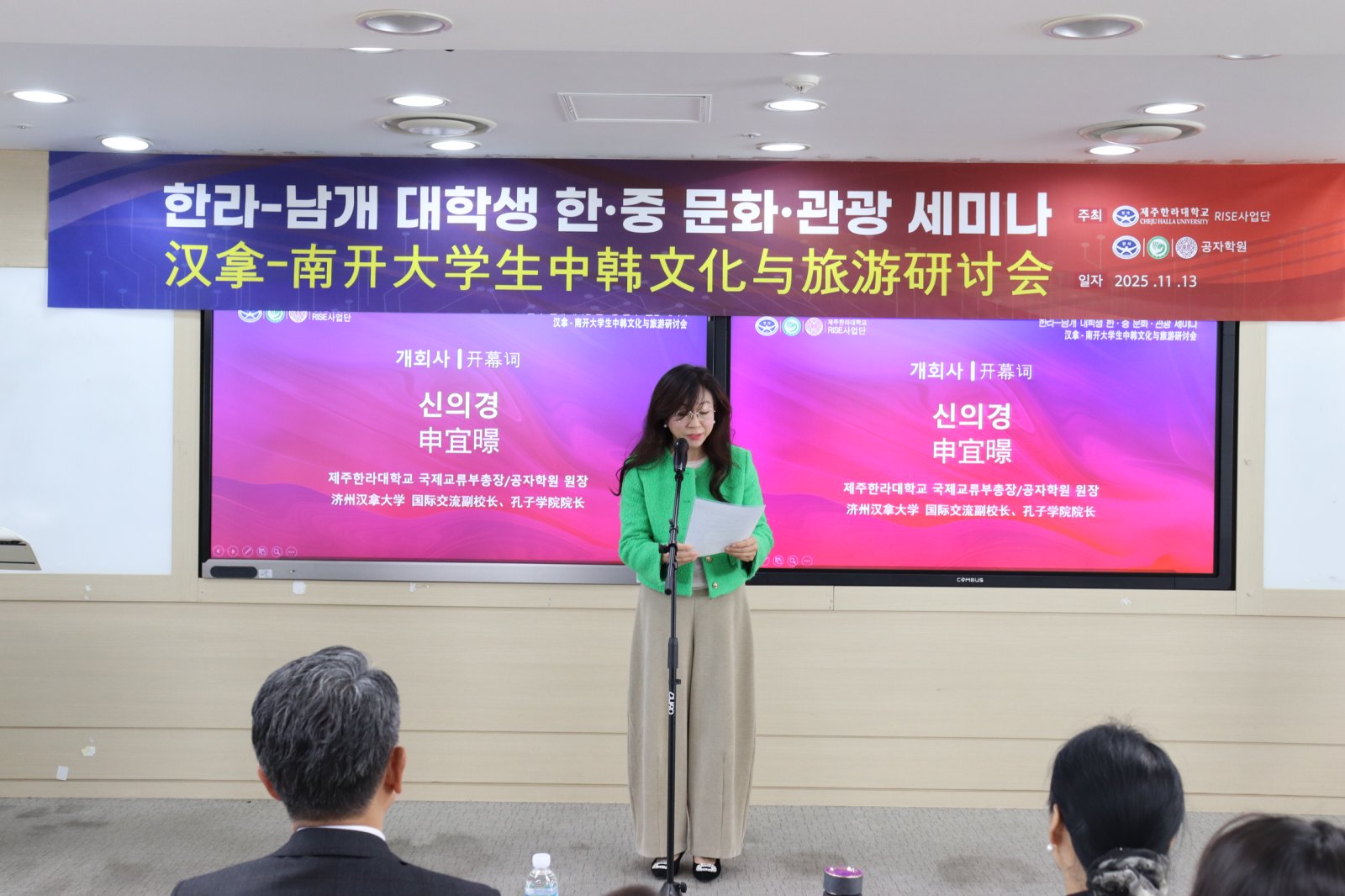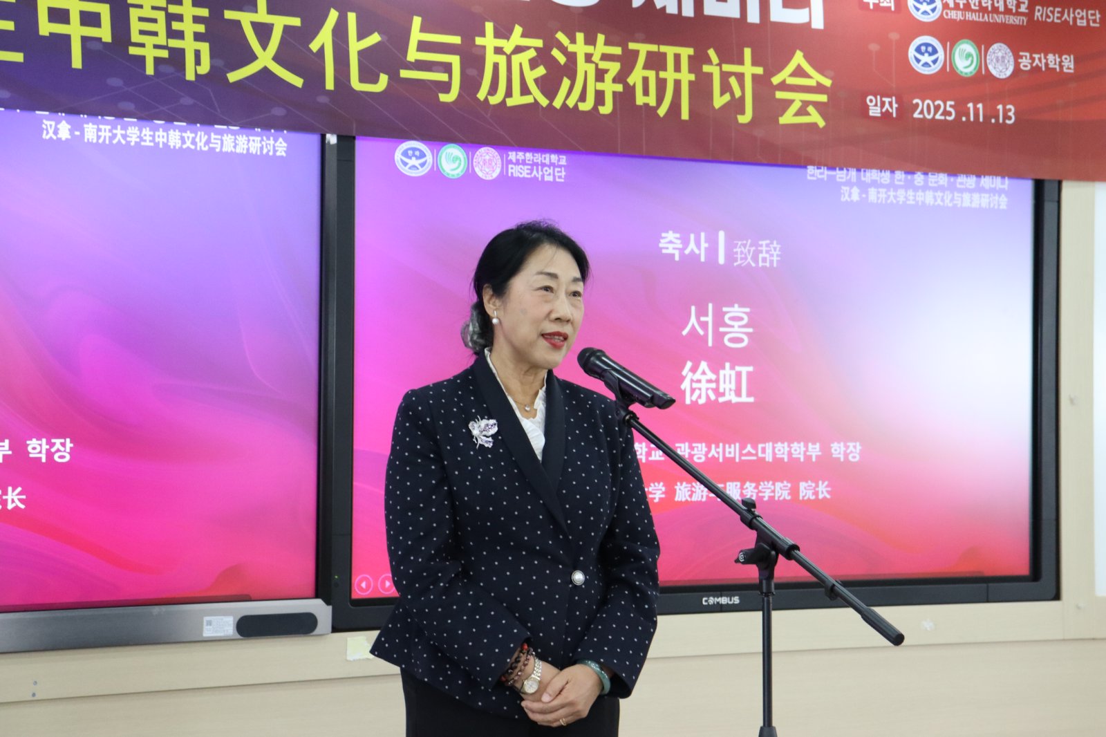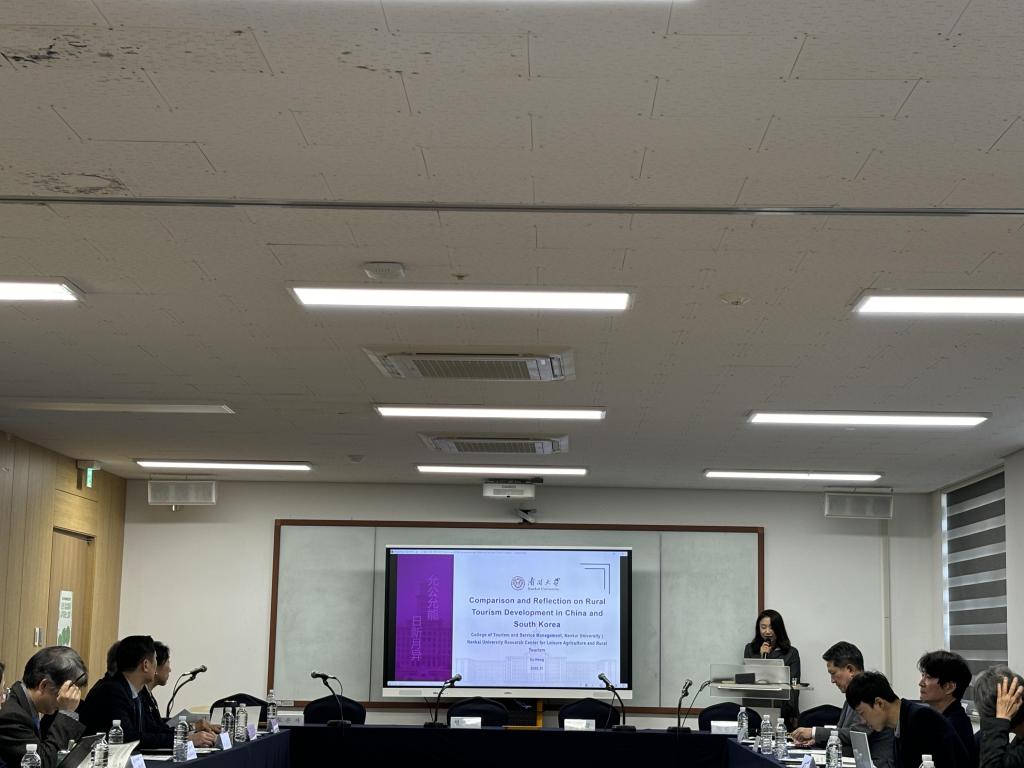 在另一场济州国际自由城市文化和旅游国际学术研讨会上,师生团队与来自韩国各高校在乡村旅游研究领域的知名学者共聚一堂。徐虹为研讨会做专题主旨报告,来自韩国的多位专家也分享了各自在乡村旅游领域的最新研究成果。同学们在一场高水平的国际学术会议中充分汲取学术营养、在学科前沿中感受跨文化碰撞思维的魅力。