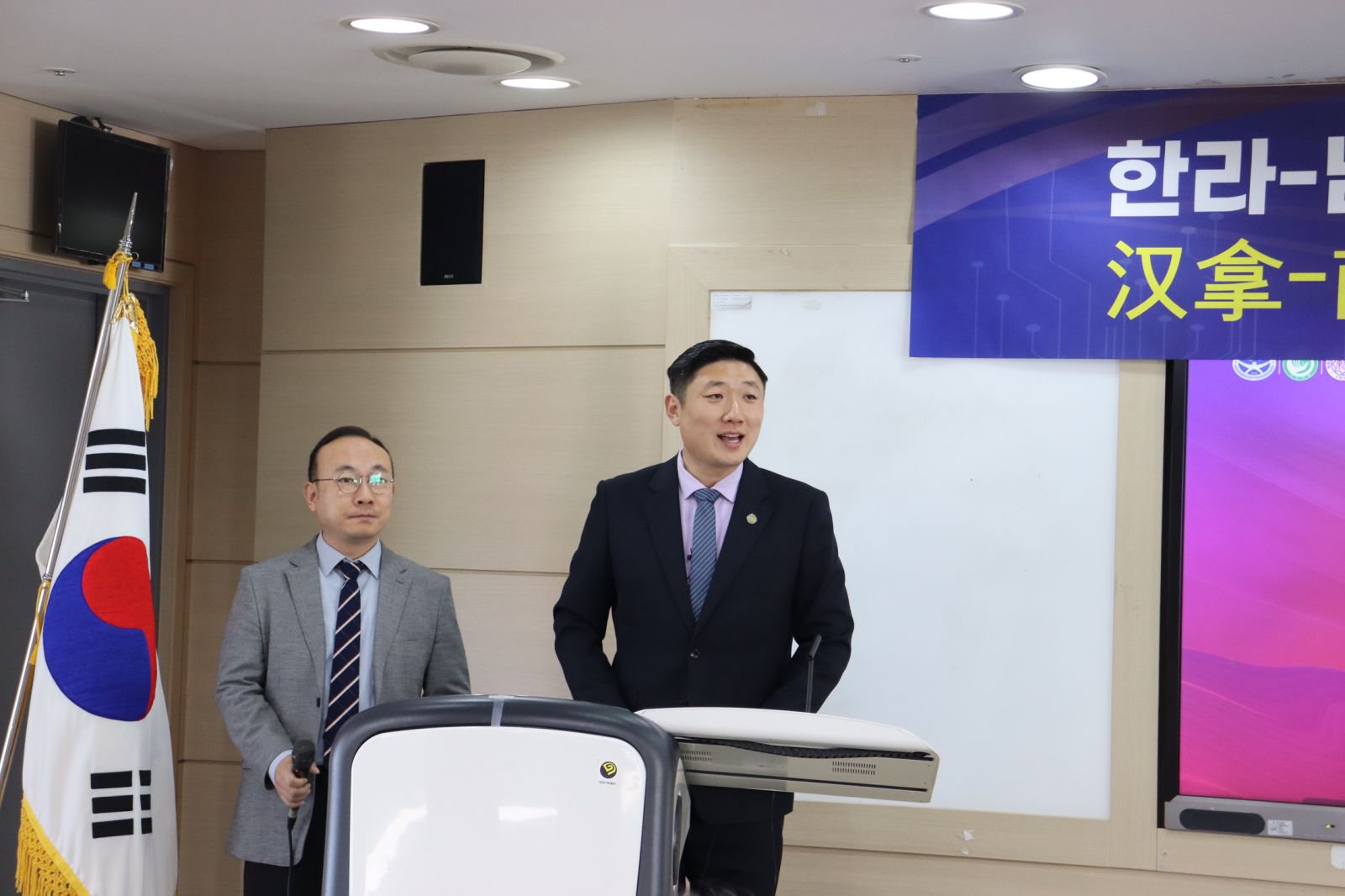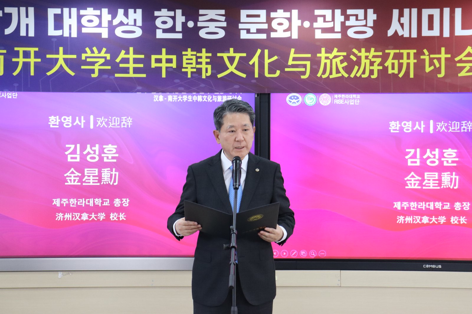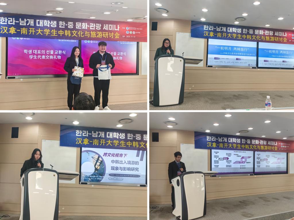 11月13日,师生团队出席了汉拿-南开大学生中韩文化与旅游研讨会。济州汉拿大学国际交流副校长申宜暻致开幕词,对师生代表团的访问表达欢迎。会上回顾了南开、汉拿两校在合作交流、共建孔院等方面合作十五年来取得的成绩,并由济州汉拿孔子学院副院长朴宇介绍了济州汉拿大学、澳门城市大学和南开大学三校合作的RISE项目计划。济州汉拿大学校长金星勲在讲话中表示,南开与汉拿拥有16年友好合作基础,此次师生团队到访对于即将启动的RISE项目具有特殊意义,希望两校能不断拓展亚洲旅游教育领域的创新合作,共同推动两校人才培养与国际化发展。徐虹在致辞中对济州汉拿大学和汉拿孔子学院表达了感谢,并介绍了南开大学旅游与服务学院的发展历程和近年来取得的各项成果,希望以此次访问促进两校旅游教育的合作与发展。会上,学院三名学生代表与济州汉拿大学的学生代表分别围绕中韩文化差异如何塑造现代旅游行为、中韩出入境游现象分析、当代中韩青年文化和旅游交流需求等主题做报告分享,从不同文化视角下展现青年学生的研究交流。双方学生代表还交换了礼物,共同表达中韩青年间的友好情谊。