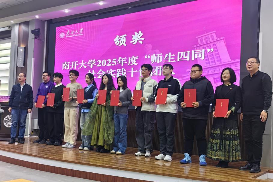 (通讯员 许瑾祎 霍菲)11月20日,南开大学2025年“师生四同”实践育人工作总结表彰会在八里台校区学生活动中心多功能厅举办。会议宣读了《2025年南开大学“师生四同”实践育人工作表彰决定》,与会领导为优秀集体和先进个人代表颁奖。旅游与服务学院在本次评选中斩获多项佳绩,学院获评“优秀组织单位”,陈晔教授荣获“十佳指导教师”称号,“中国大运河博物馆文旅融合创新机制研究”团队获评“十佳团队”并在会上进行了展示汇报。
