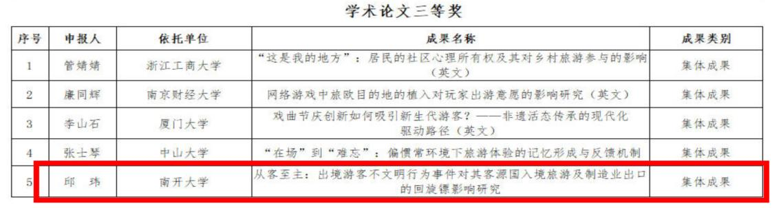 (通讯员 于晓雅)近日,中国旅游研究院(文化和旅游部数据中心)公示2025年文化和旅游优秀研究成果名单。本年度共遴选出27项优秀研究成果,其中,学术论文10项、专著10项、研究报告7项。我院邱玮副教授团队的研究成果《从客至主:出境游客不文明行为事件对客源国入境旅游及制造业出口的回旋镖影响研究》荣获学术论文三等奖,彰显了我院在文旅研究领域的前沿探索实力。