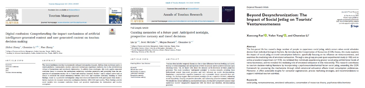 (通讯员 张志慧)近期,在我院李春晓教授指导下,博士生李琳、张志慧以及硕士生范雪聪围绕“数智文旅”这一前沿研究领域开展了系统研究,相关研究成果分别发表于旅游管理学科三大国际顶尖期刊TM、ATR和JTR。这些研究从消费者行为视角出发,有机对接国家“十五五”战略规划方向,推动了旅游休闲学科的自主知识体系理论创新,赋能文旅融合战略背景下的智慧旅游建设,为在新时期通过文旅融合提振我国旅游市场消费提供了可参照的理论支撑。