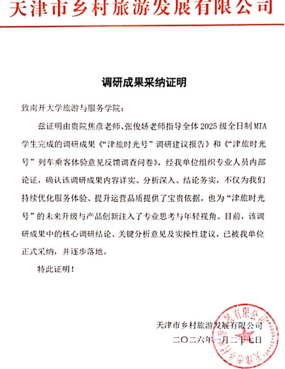 (通讯员 陈思雯)近日,南开大学旅游与服务学院收到来自天津旅游集团乡村旅游发展有限公司的感谢。并明确表示,由学院MTA教育中心焦彦、张俊娇老师带领2025级全日制MTA学生,为全国首列沉浸式主题娱乐文旅专列“津旅时光号”所提供的专业调研成果与建议,已被公司正式采纳,并开始应用于服务优化与产品升级的实际工作中。这标志着一次成功的“移动课堂”专业实践,实现了从理论教学、实地调研到产业应用的全链条落地。