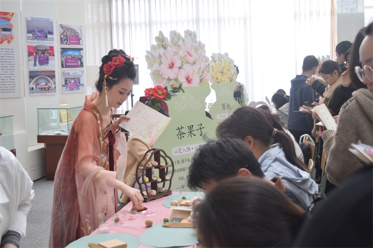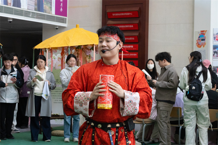 “卖花声里过花朝”国风沉浸式表演是本次活动的一大亮点。由学生志愿者扮演的“十二花神”身着传统服饰、手持时令花束翩然而至,通过诗词问答与现场师生开展文化互动。