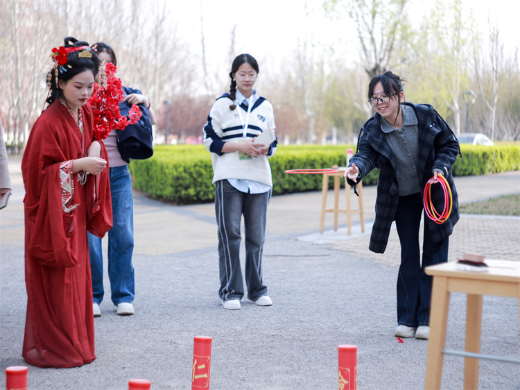 花朝节又称花神节,是中华民族传统岁时节日之一,寓意百花诞辰、春回大地。本次游园会将古时“赏红簪花”“游春扑蝶”的雅趣引入校园。室内活动现场,拓印、花钿、剪纸等八个非遗体验展位依次排开,志愿者们在示范技艺的同时,细致讲解非遗项目的历史渊源与工艺特征,让师生在动手体验中领悟传统技艺背后的文化底蕴。室外绿地上,投壶、蹴鞠、木射等传统游艺项目吸引了众多师生参与,现场欢声不断,仿佛置身于古时的春日踏青现场。