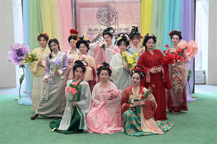 随着清脆的卖花叫卖声与悠扬古乐响起,情景表演拉开帷幕。“花神”们吟诵经典,举手投足间尽显古典神韵。表演还融入了戏曲小调、泉州南音等非遗艺术形式,服饰造型涵盖战国裙裾、明制华服及少数民族服饰,全方位、多维度地展示了中华传统文化的多元魅力。