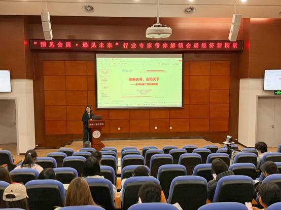 讲座伊始,王菁娜介绍了到场嘉宾背景,并简要讲解了会展行业的基本概况。随后,杨琪围绕会展行业核心内容展开分享,明确会展的核心特征与多领域价值,阐述其在国家发展战略中的重要地位,同时结合最新行业数据,系统梳理了我国会展业的发展历程与当前现状,让在场师生对行业有了全面认知。