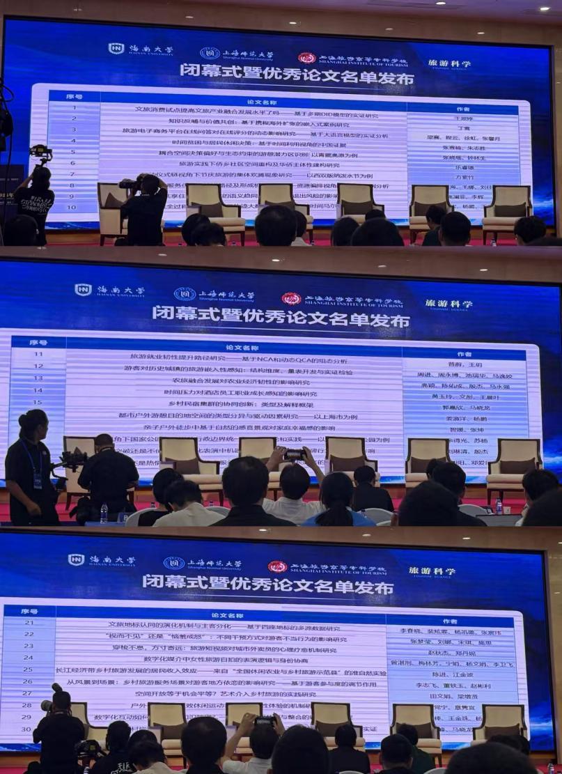 本次年会共评选出30篇优秀会议论文,我院师生共有5篇主导完成的成果入选,分别是:《旅游电子商务平台在线问答对在线评分的动态影响研究——基于大语言模型的实证分析》(梁赛、程云、徐虹、张馨月),《共享住宿房源描述的语义趋同风格对市场退出风险的影响研究》(高澜菲、李辉),《乡村民宿集群的协同创新:类型及解释框架》(郭嘉欣、马晓龙),《亲子户外徒步中基于自然的感官景观对家庭幸福感的影响》(智媛、张坤),《文旅地标认同的演化机制与主客分化——基于四座地标的多源数据研究》(李春晓、裴炫霏、杨凯璐、张宸玮)。