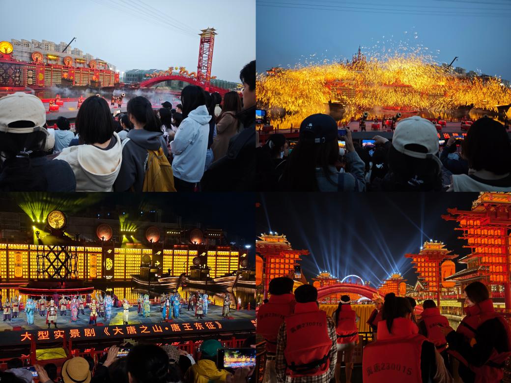 下午,同学们转至以大唐文化为主题、水景与仿古建筑相映成趣的河头老街。同学们深入走访沿街商铺,驻足观赏多处民俗演艺节目,感受景区活态文化的呈现方式。学生们还积极参与了沉浸式NPC互动环节,切身体验了景区如何通过角色扮演增强游客的代入感和情绪价值。晚间,全体师生共同观看了大型实景演出《唐王东征》,震撼的视听效果与叙事节奏引发了大家对旅游演艺项目策划的深入思考。