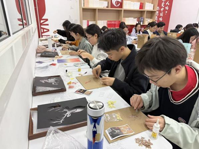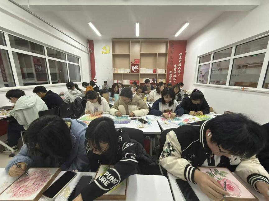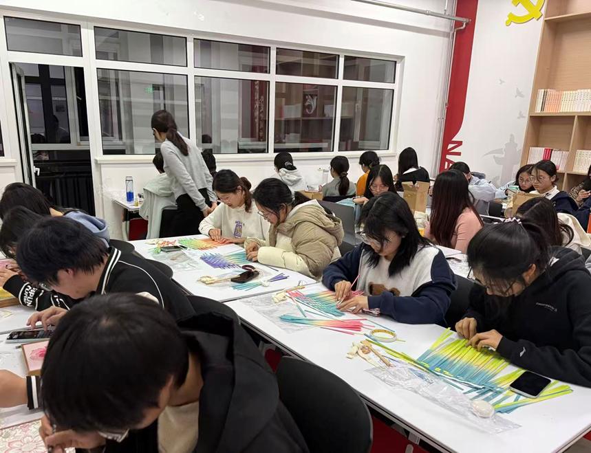 创作过程中,同学们全神贯注、巧思迸发,穿针引线、编织镶嵌间,将焦虑与疲惫慢慢转化为创作灵感。工作人员全程值守,及时答疑解惑、指导技巧,为大家的创作保驾护航,让同学们在专注实践中,真切感受手工乐趣与非遗底蕴。