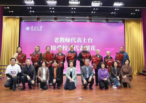 南开大学旅游与服务学院退休教师王健教授(左二排三)受邀参加会议并上台接受95届毕业生白燕(左一排三)献花。